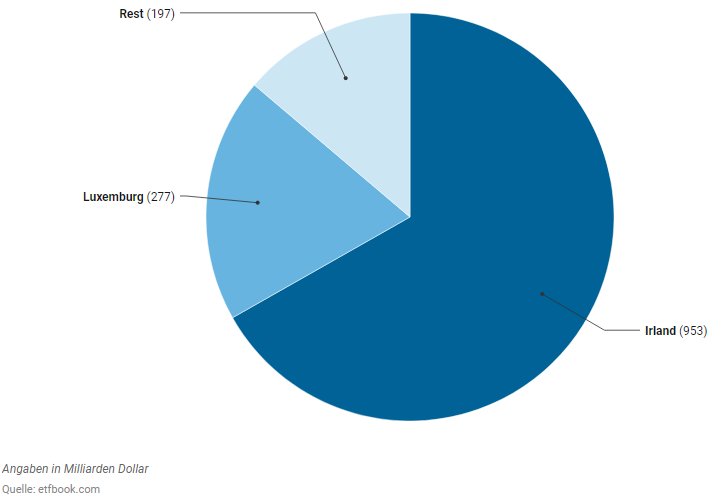 Irland kann mit einer Gesamtanzahl von rund 1.800 ETFs und somit einem ETF-Volumen von 953 Milliarden US-Dollar auftrumpfen. Während es in Luxemburg „nur“ 277 Milliarden US-Dollar sind. Somit beherrscht Irland den europäischen ETF-Markt mit einem Marktanteil von 67%.